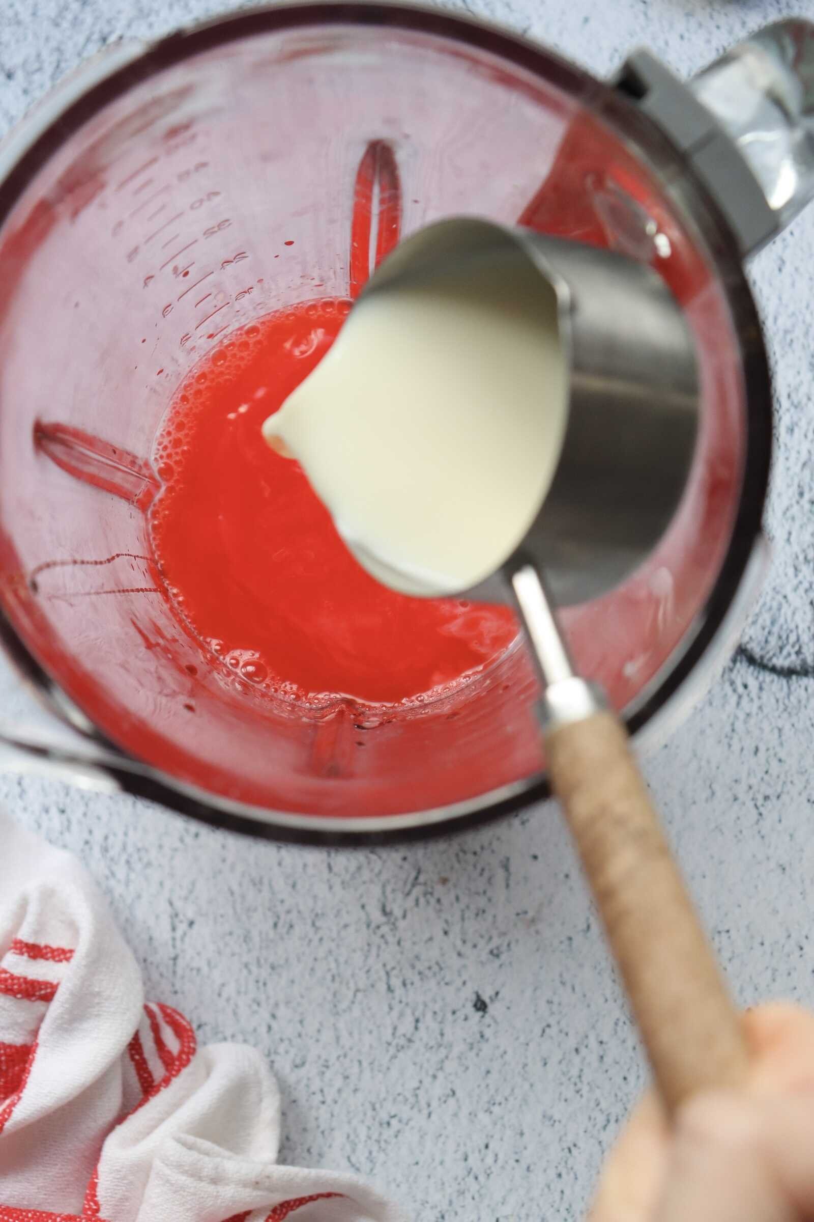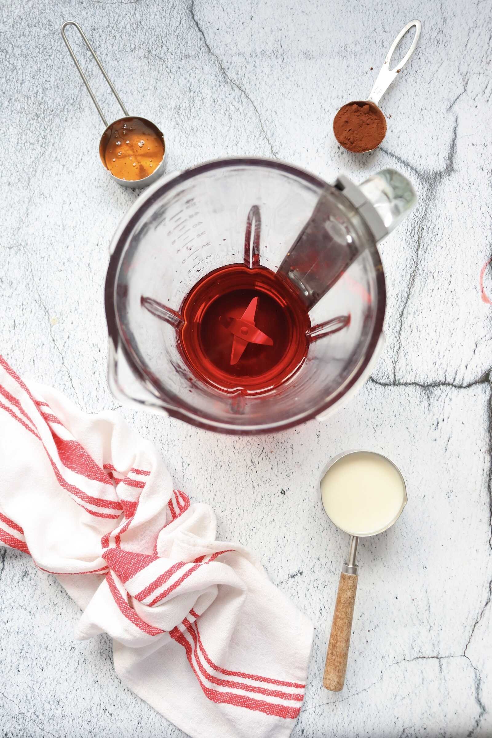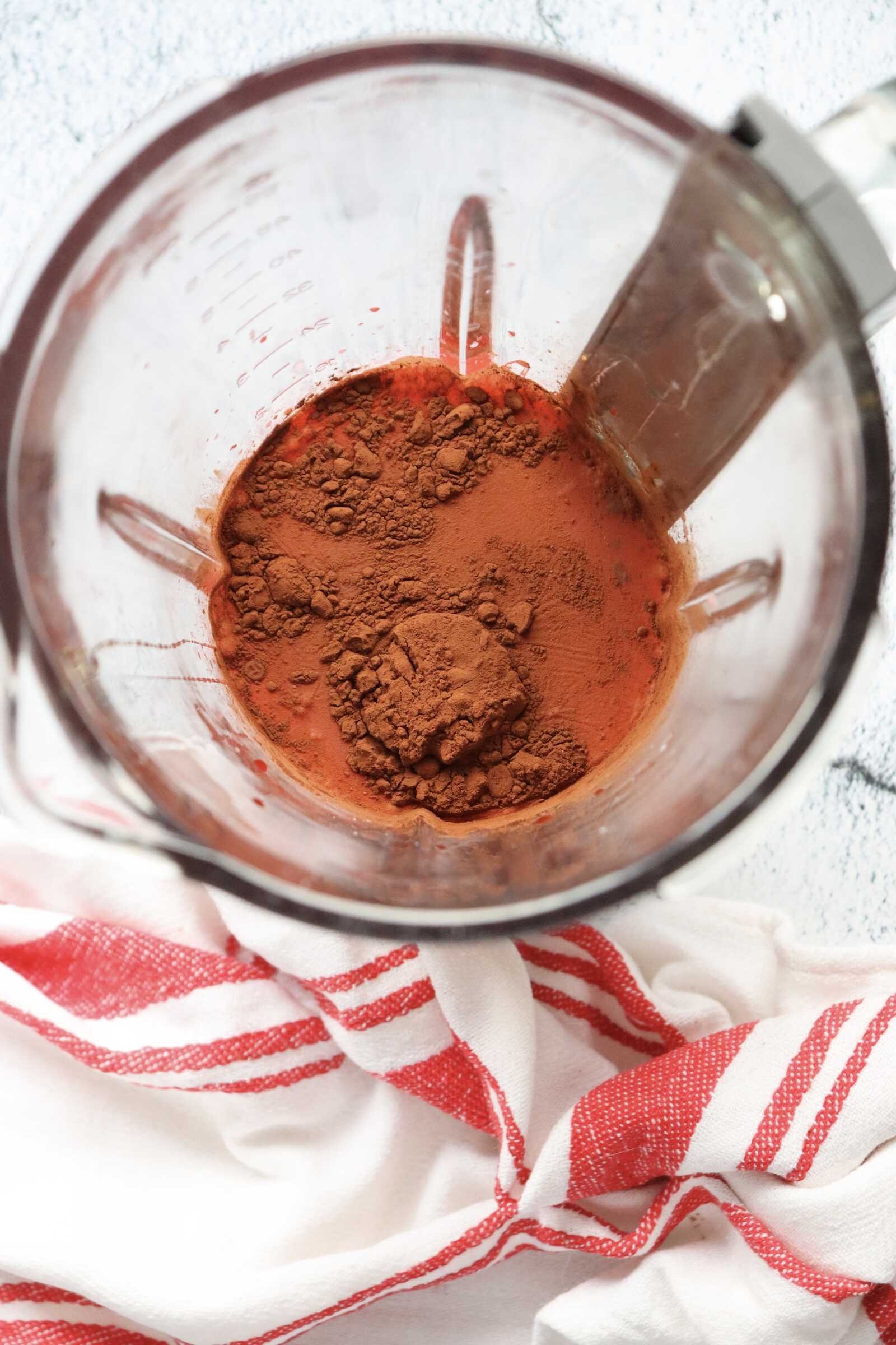 Blend until completely smooth. The cocoa powder should be fully incorporated, creating a creamy, rich red velvet-inspired base.