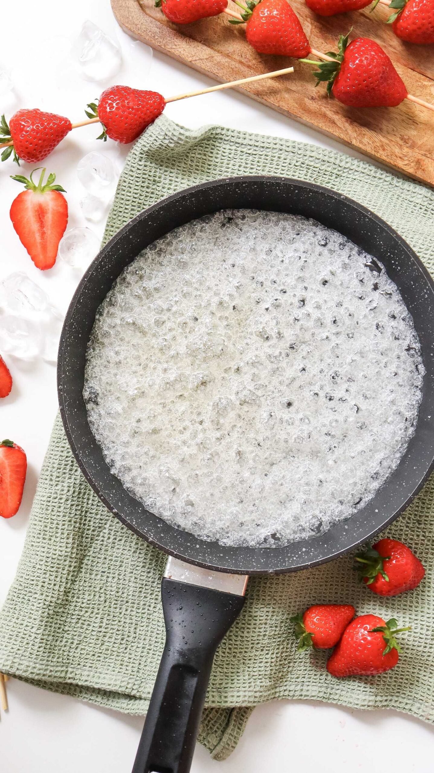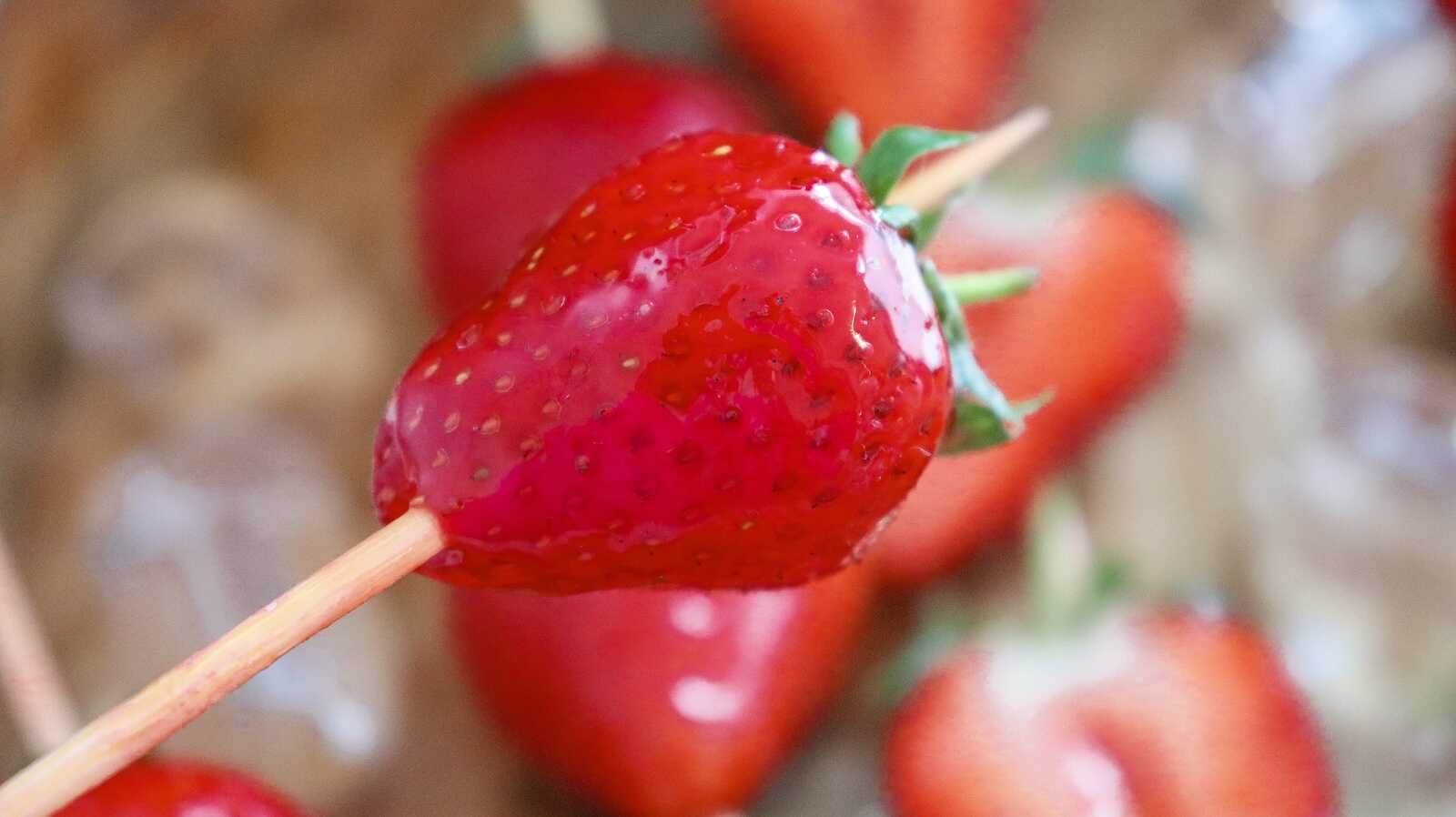 - Dip each strawberry skewer into the hot sugar syrup