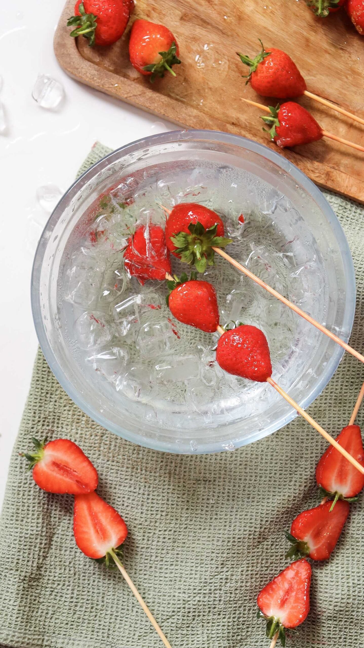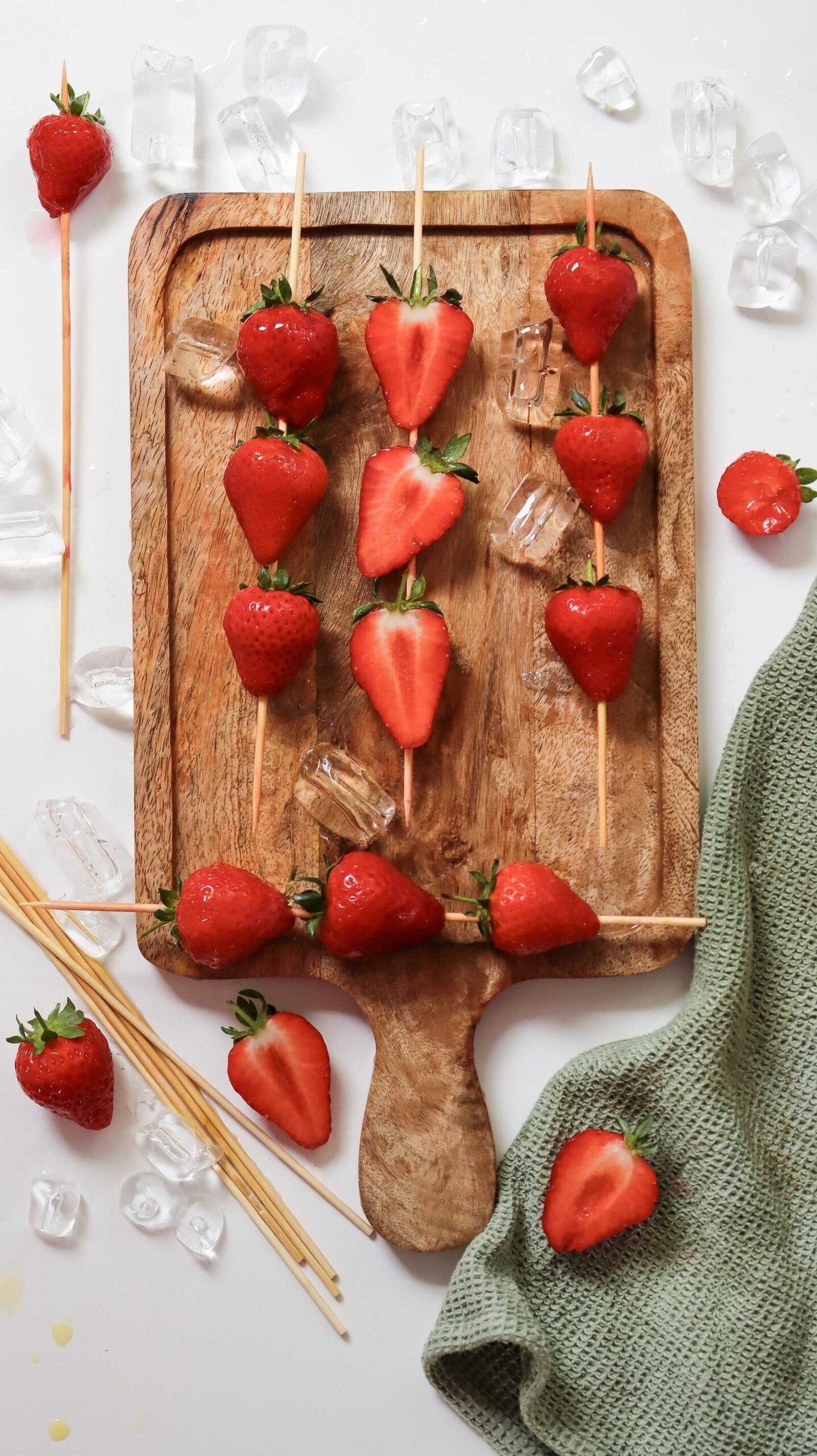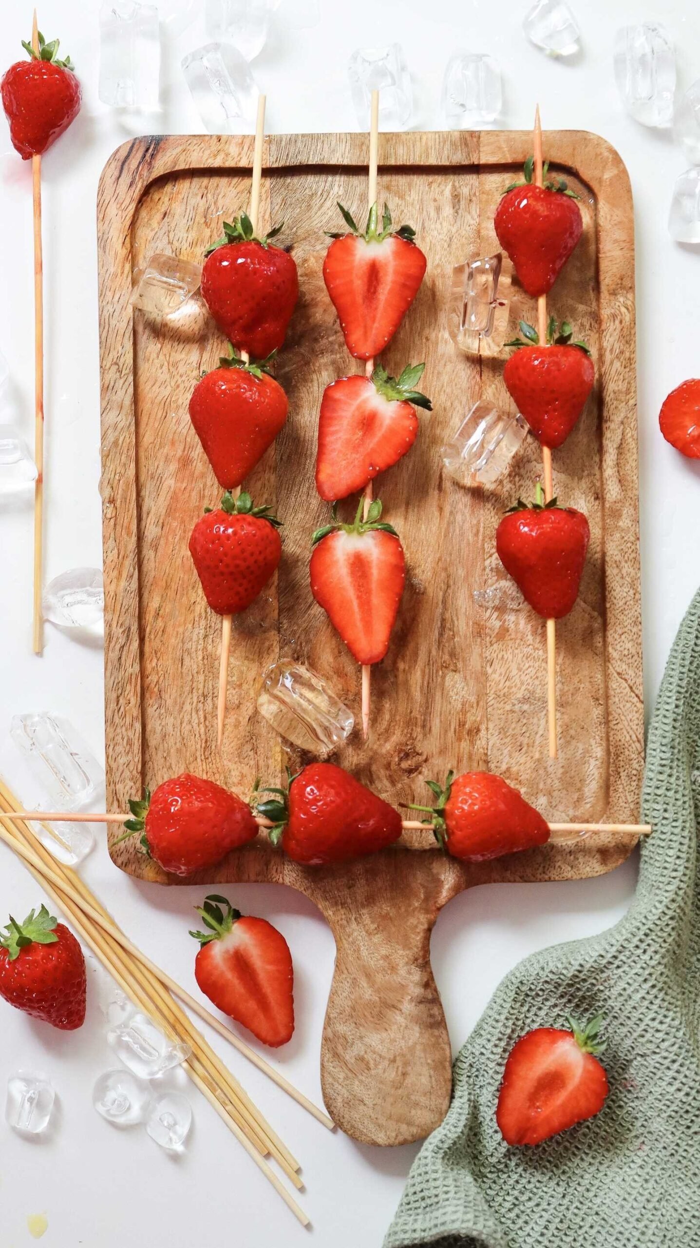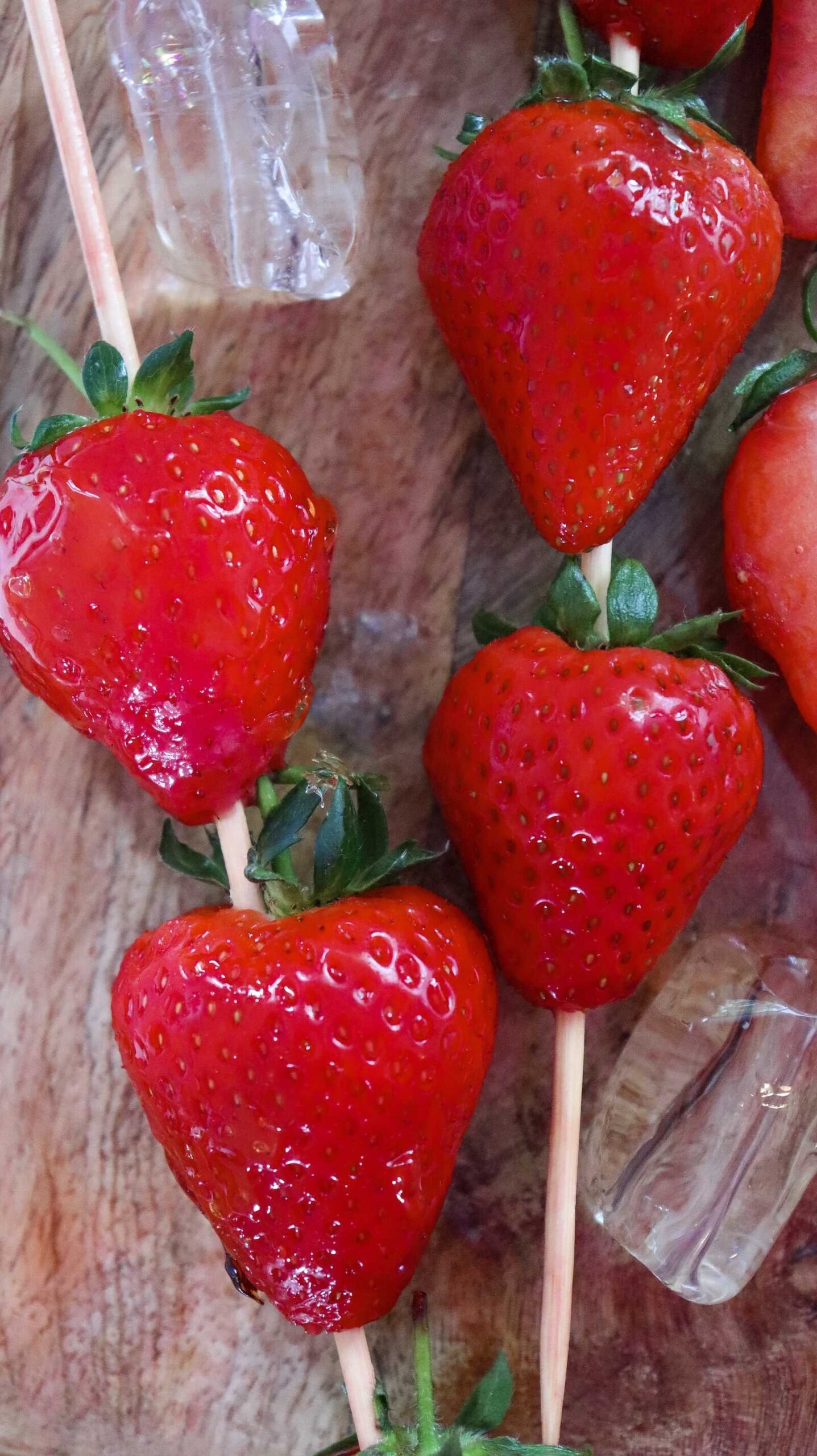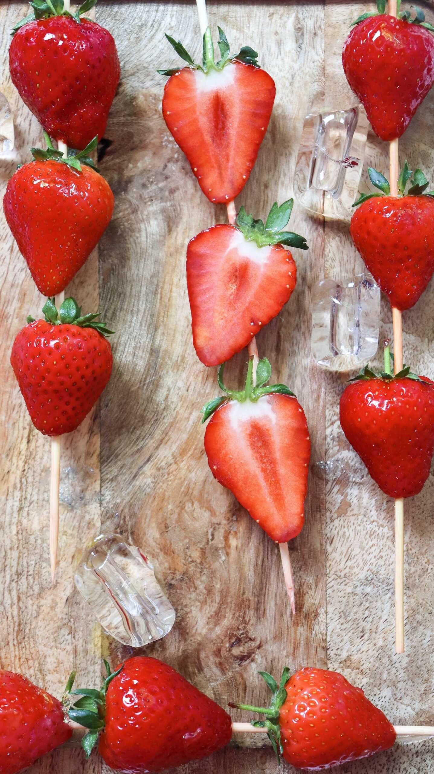 - Skewer 2–3 strawberries per wooden stick