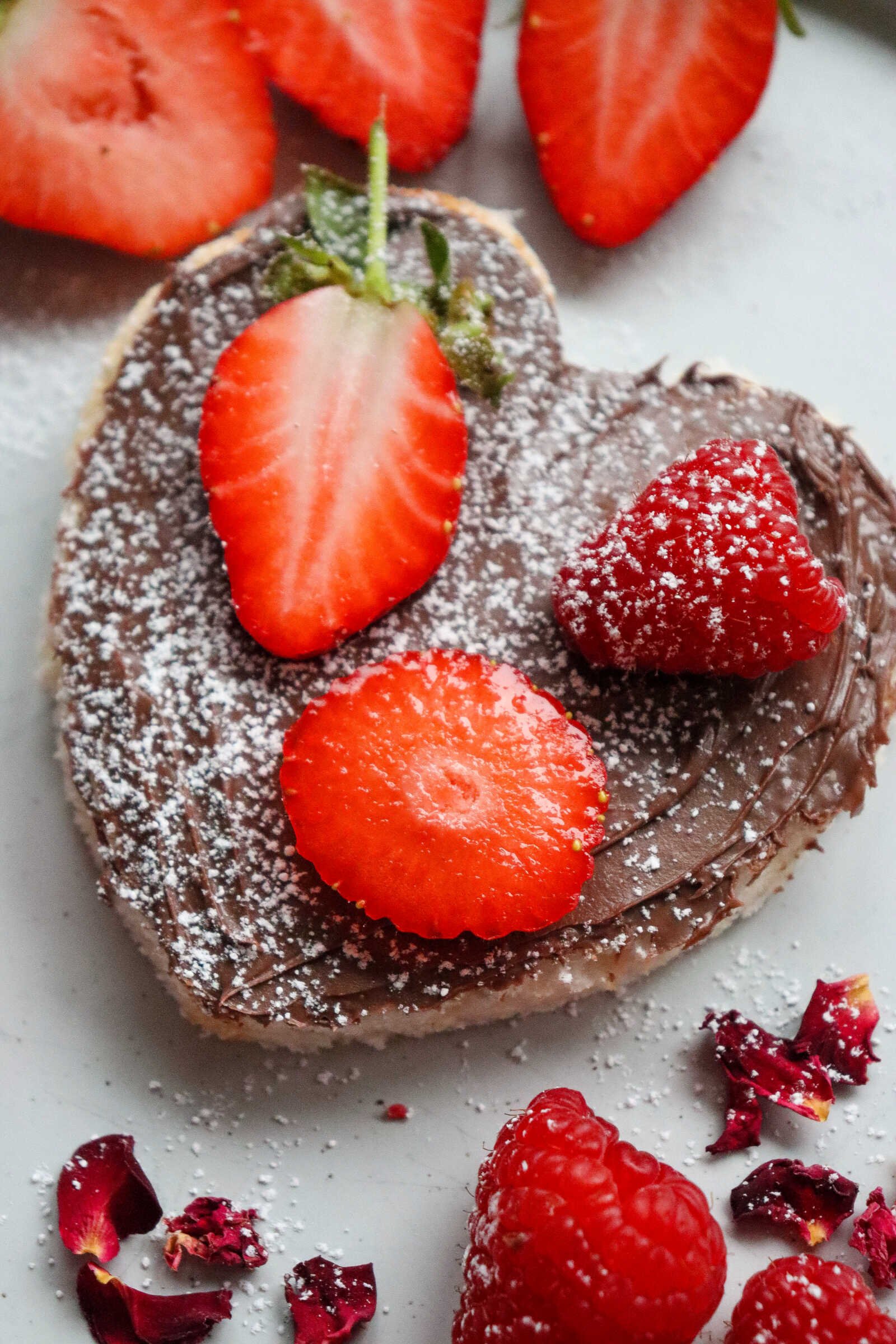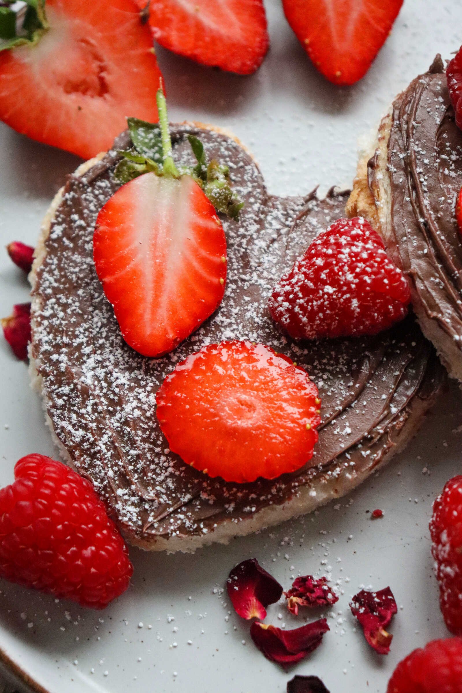 Strawberry Nutella Heart Toast topped with fresh strawberries and raspberries on a plate.