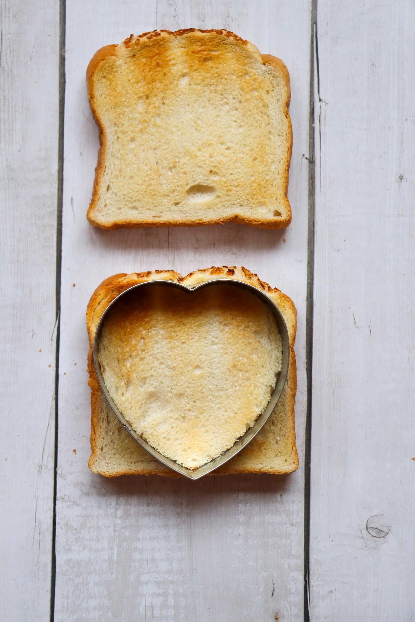 Once your toast is done, use a heart-shaped cookie cutter to cut each slice into a heart.